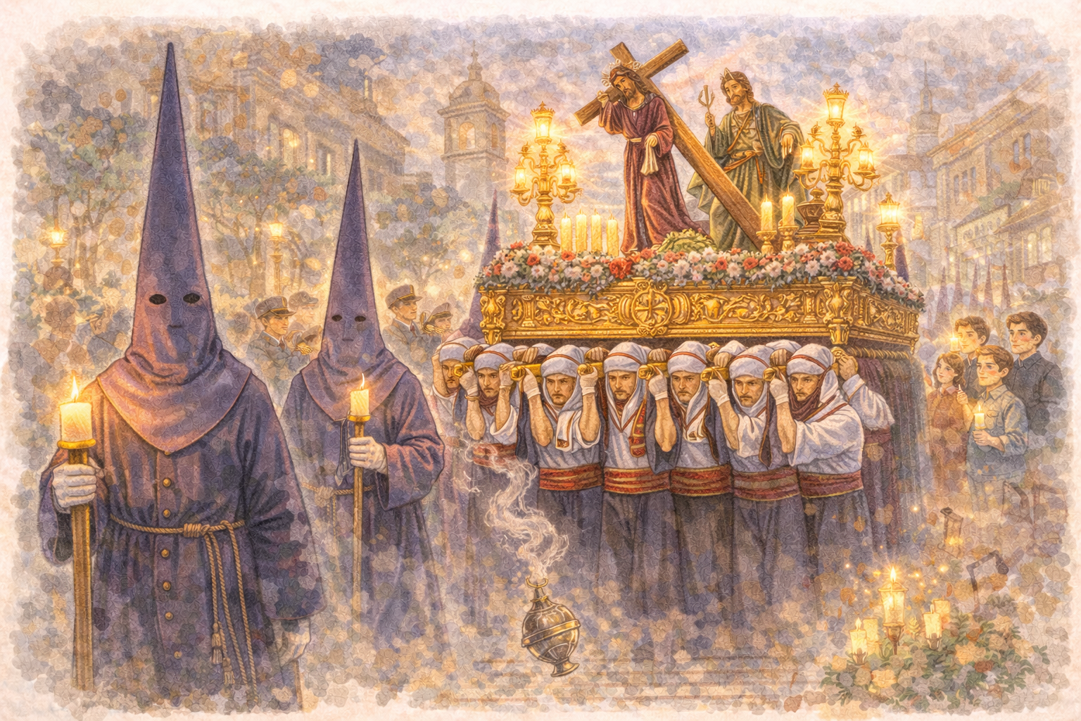 One of the best-known elements of Easter in Spain is the processions. In them, the brotherhoods take part; these are associations that organize the routes and preserve their traditions. During the procession, there are nazarenos, who walk wearing tunics and pointed hoods, and also costaleros, who carry the pasos. The pasos are platforms with religious images that often have great artistic value. All of this creates a very special atmosphere where silence, emotion, music, and respect come together.