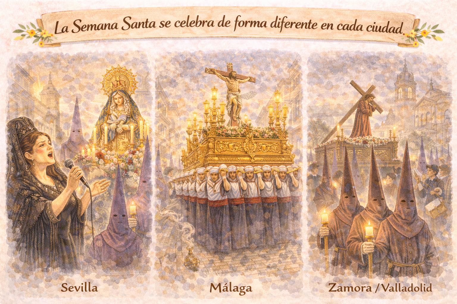 Easter in Spain is one of the most important celebrations of the year and also one of the most representative parts of Spanish culture. It is a very useful topic because it helps them learn real vocabulary, discover local customs, and better understand how tradition, religion, art, and social life come together.