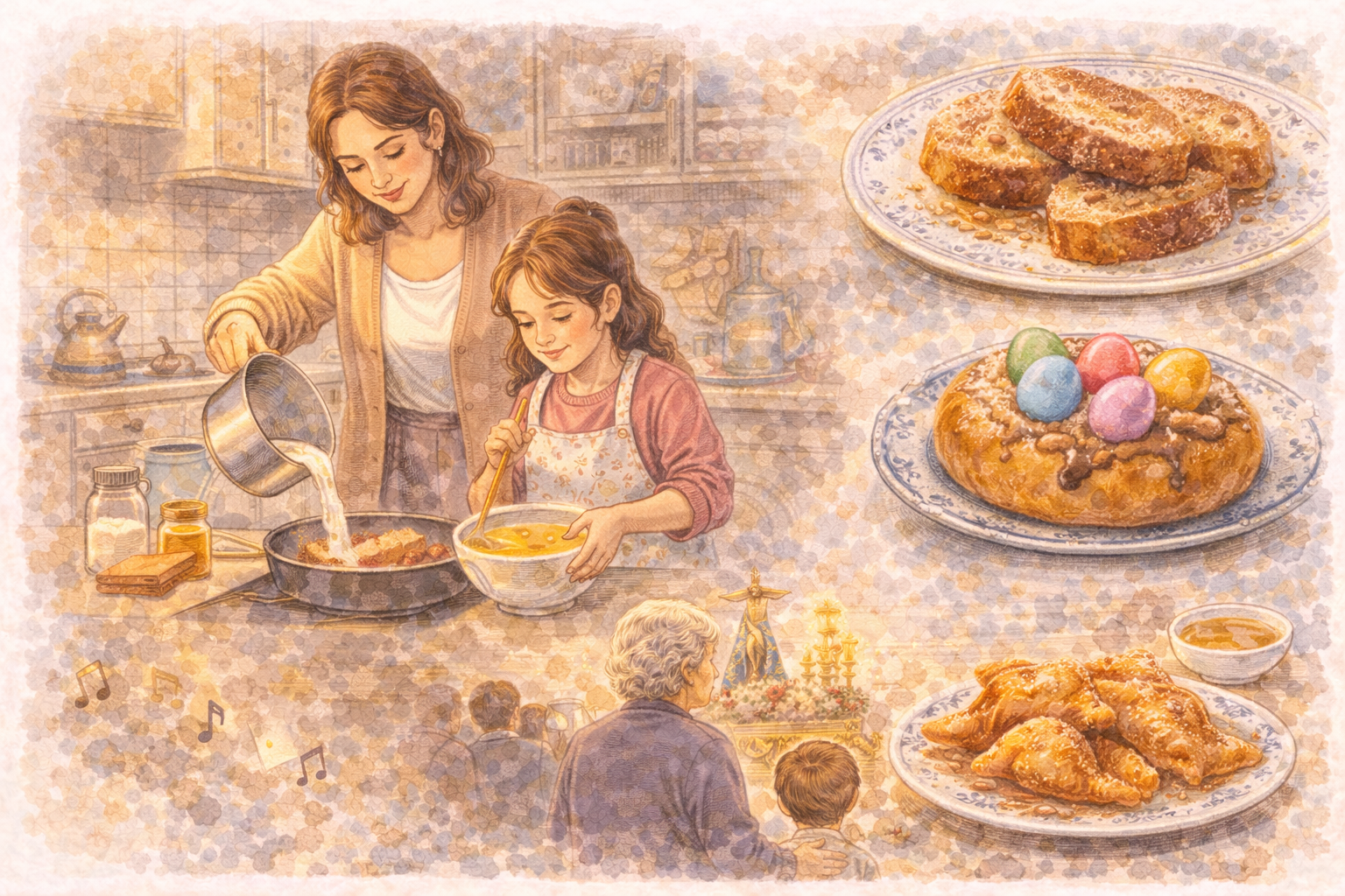 La Semana Santa también se vive a través de la comida. En muchas casas españolas es típico preparar dulces tradicionales durante estas fechas. El más conocido es la torrija, un postre hecho normalmente con pan, leche, azúcar, canela y huevo. En algunas regiones también son típicos otros dulces, como la mona de Pascua o los pestiños. Esto demuestra que la Semana Santa en España no solo se celebra en la calle, sino también en casa y alrededor de la mesa.